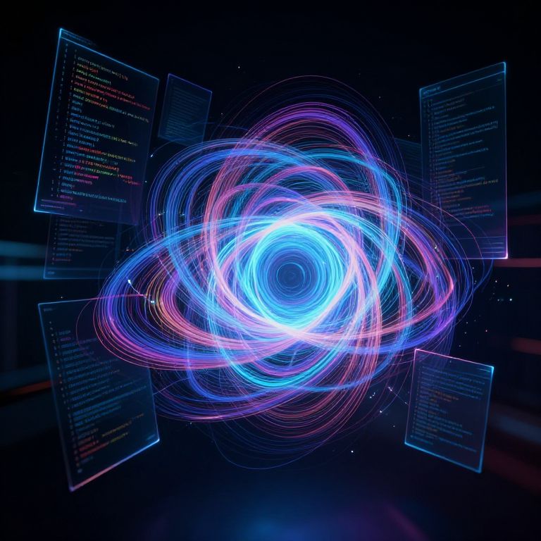 Digital art: Neon blue and pink swirling vortex at center, surrounded by floating text boxes on a dark, starry background.