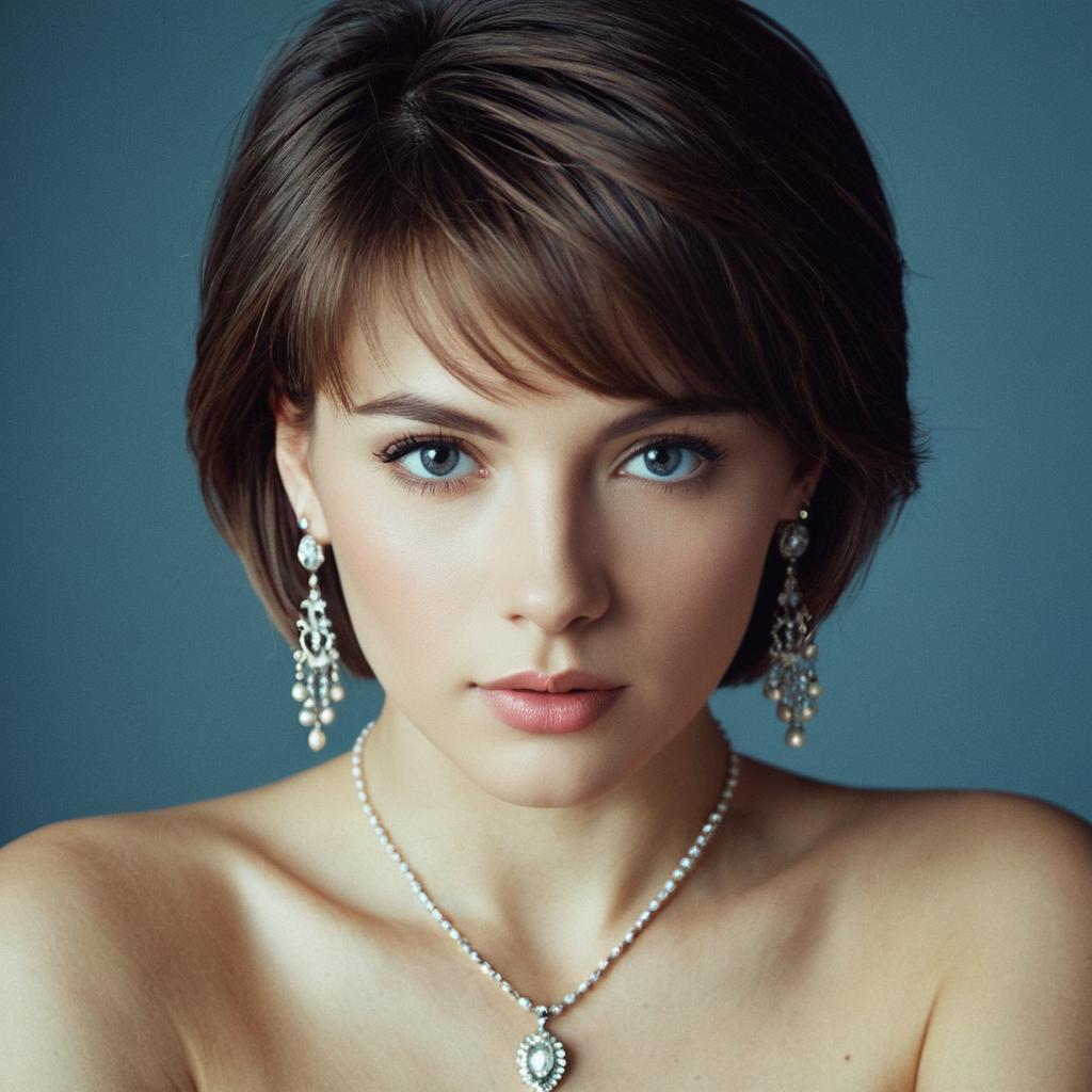 Medieval short hairstyle,1girl, solo, jewelry, necklace, realistic, looking at viewer, brown hair, short hair, blurry, blurry background, lips, upper body, photorealistic