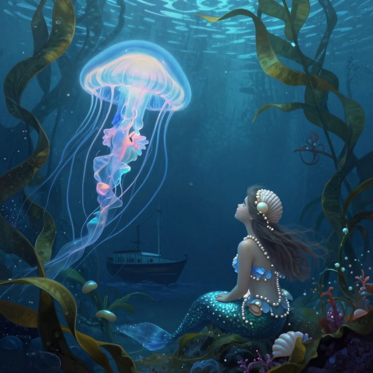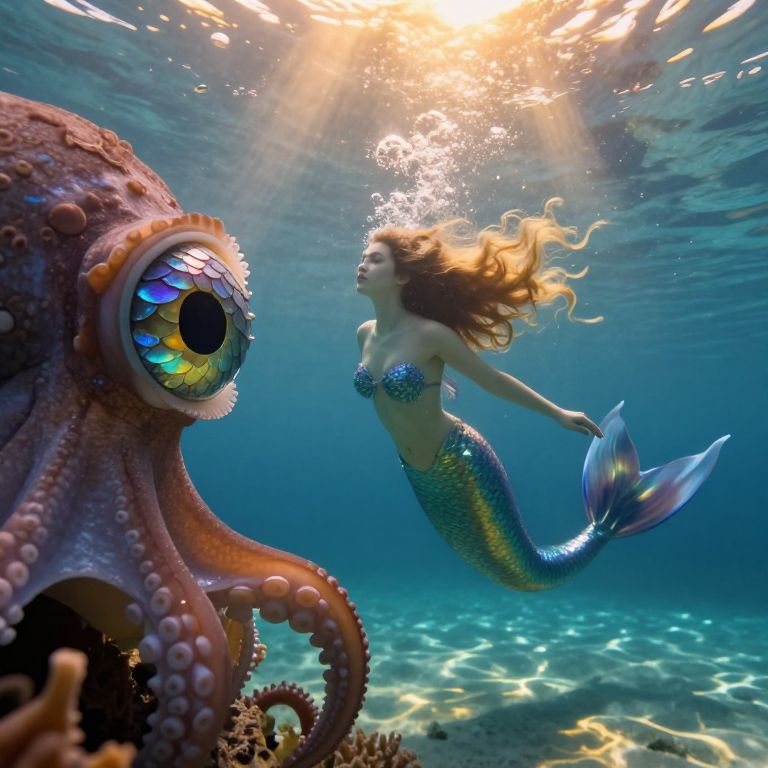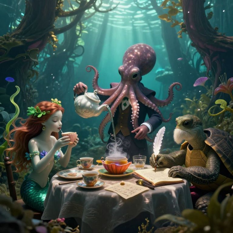 A surreal digital art composition depicts an enchanting underwater tea party from a bug's perspective within a mysterious forest. The scene features an octopus host adorned in formal attire, pouring a mesmerizing liquid from a teapot as guests partake in the gathering. A mermaid with hair resembling seaweed sips from her shell cup, while a wise turtle scholar diligently records ancient sea tales using a glowing quill. Soft, otherworldly light filters through the dense aquatic foliage, casting intricate shadows that dance across their features, evoking an atmosphere of wonder and unity among these extraordinary friends.