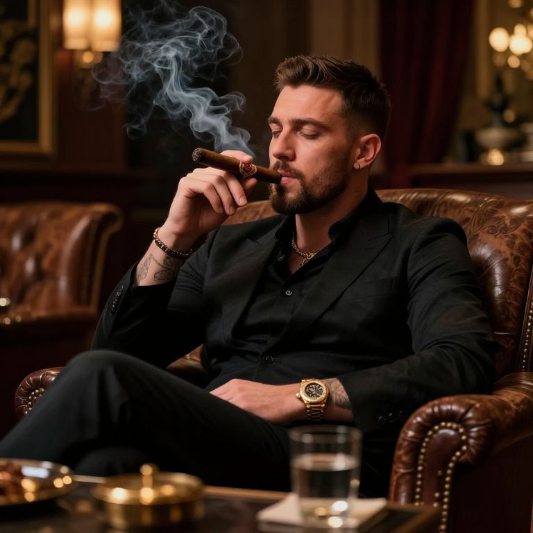 A photograph of a handsome, bearded man with short dark hair, sitting on a brown leather armchair in a dimly lit, luxurious room. He is wearing a black button-up shirt and black pants, accessorized with a gold watch and a gold necklace. He is smoking a cigar, with blue smoke curling upwards. The background features warm, golden lighting and wooden paneling. A glass of water and a tray with ashtrays are on a table in the foreground. The overall ambiance is sophisticated and relaxed.
