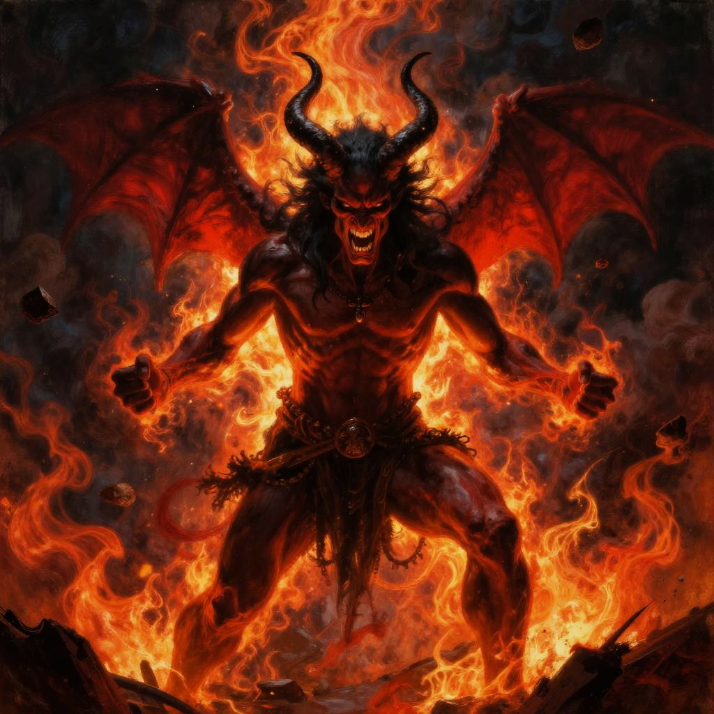Satan angry painting, epic confrontation scene featuring a wrathful satanic entity surrounded by flames and dark clouds, aggressive pose with clenched fists, vibrant reds and oranges contrasted with deep blacks, high detail dramatic artwork