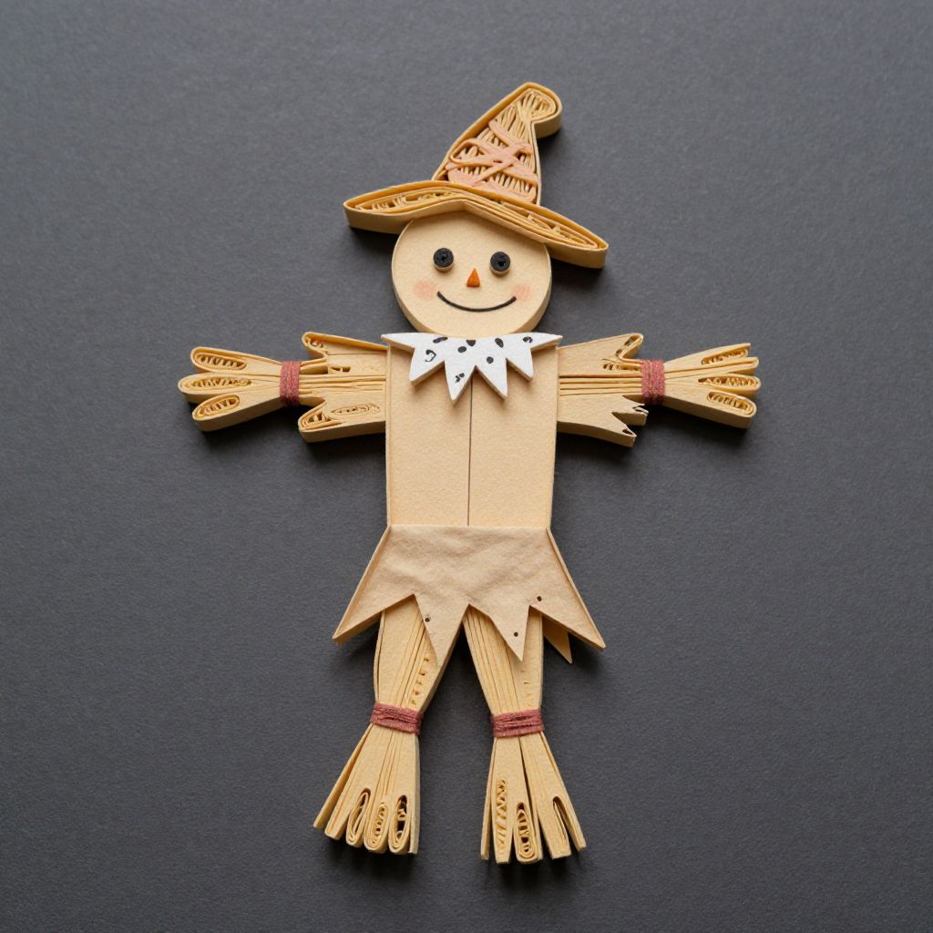Cube paper quilling Scarecrow, A straw man with floppy arms and legs, built like an athletic ballet dancer, wearing tattered clothes and a hat,