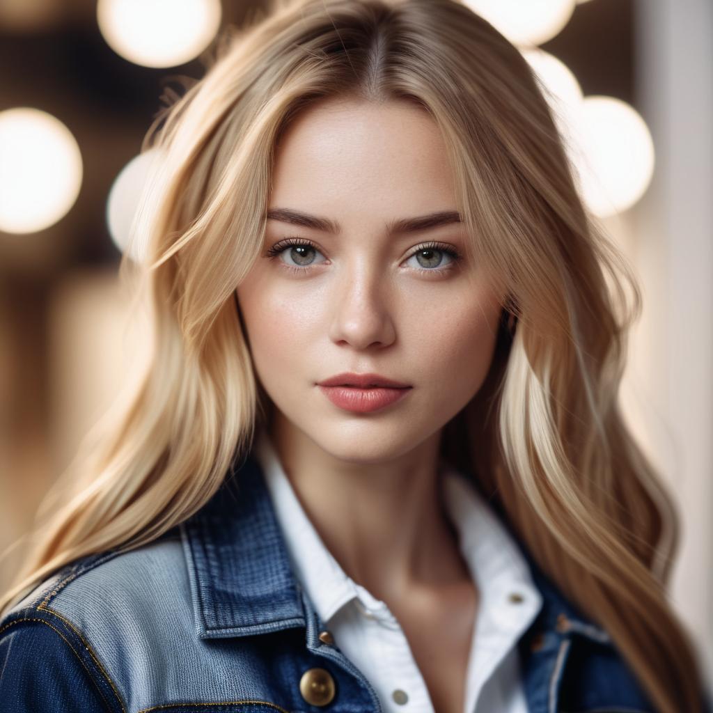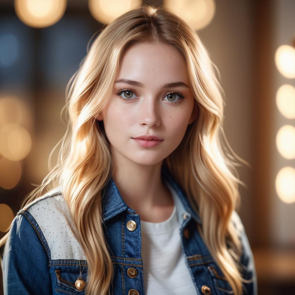 A young woman with long natural blond hair wearing a denim jacket and white shirt, soft natural lighting highlighting her subtle freckles and skin texture, casual modern look indoors with blurred warm lights in the background, realistic portrait style