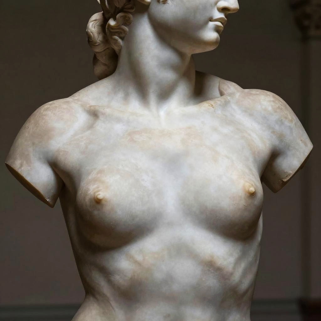 Big boobs head sculpture concept, marble texture, classical art influence, dramatic shadows and highlights, realistic anatomy, elegant and powerful expression, museum exhibit style