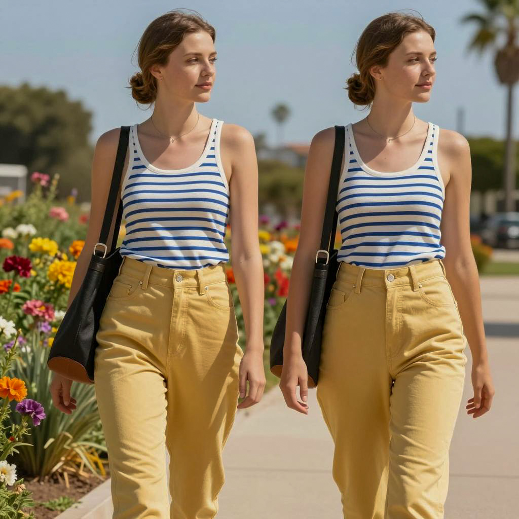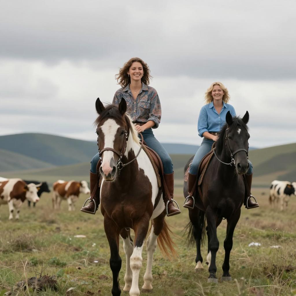 Orangish vintage pickup truck in a grassy field, woman with light brown hair in white dress sitting in front, legs crossed, smiling, green forest and hills in background, blue sky with clouds, daytime, casual style.