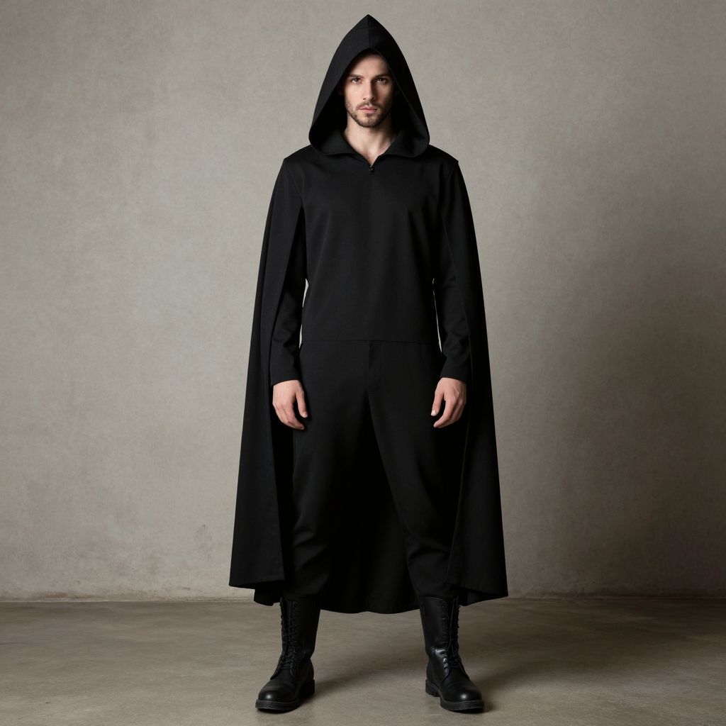 Dark coven costume, 1boy, male focus, solo, hood, standing, boots, full body, pants, indoors, black footwear, facial hair, cloak, hat, black pants, long sleeves
