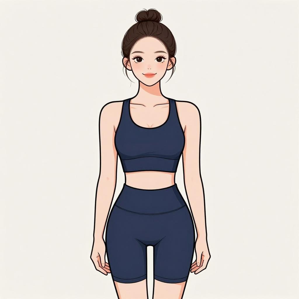 Digital illustration of a smiling Asian woman with dark hair in a ponytail, wearing a light turquoise sports bra and shorts, standing against a plain white background