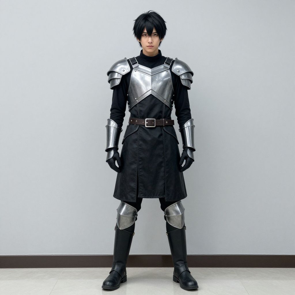 Photograph of a young Asian male standing against a plain, light gray background. He has short, black, slightly messy hair and a serious expression. He is wearing full medieval-style silver armor, including a chest plate, shoulder guards, a black tunic with a belt, black gloves, and knee guards. His black pants are visible beneath the armor. The floor is a smooth, light gray concrete. The armor is shiny and reflective, contrasting with the matte black tunic and gloves. The overall style is realistic and detailed, emphasizing the texture and shine of the metal.