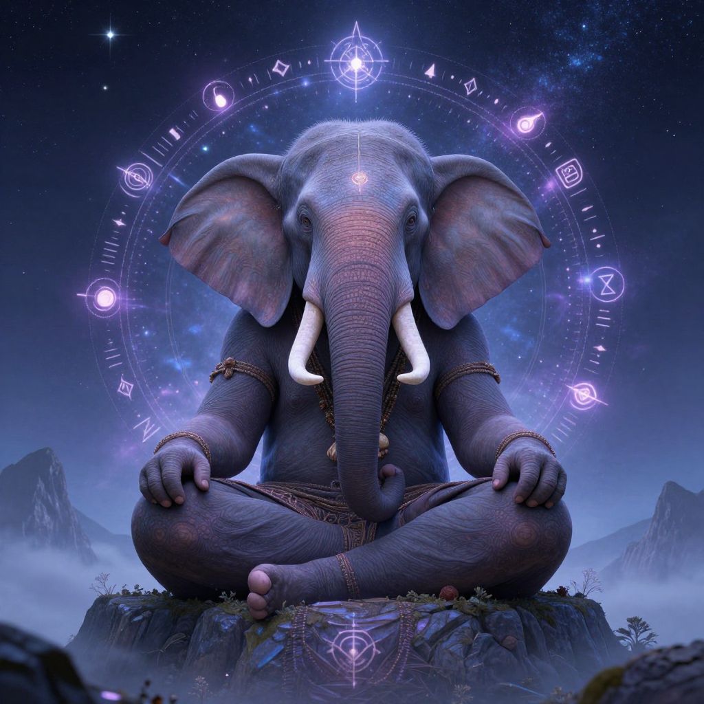 Digital artwork of a seated, mystical elephant with gray, textured skin and large, white tusks. The elephant, adorned with gold jewelry, sits cross-legged on a rocky, mountainous terrain under a starry, cosmic sky. Surrounding the elephant's head is a glowing, circular mandala with purple and blue symbols, including a pentagram and eyes, enhancing the mystical vibe. The background features a twilight gradient with misty mountains. The elephant's expression is calm and meditative, exuding wisdom and spirituality. The overall style blends fantasy and cosmic elements with a magical, otherworldly atmosphere.