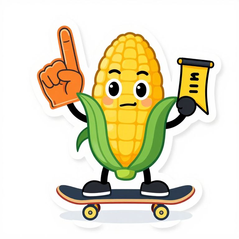 Cartoon corn character with yellow ear, green leaves, black arms, and legs, holding index finger up and a measuring tape, skateboarding.