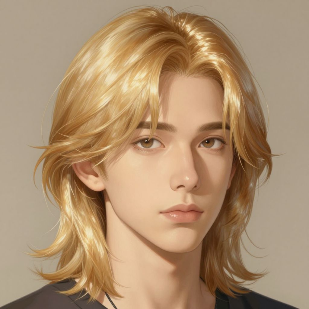 Pretty young man with shoulder length shiny shimmering golden blond hair, path traced, highly detailed, high quality, digital painting, by studio ghibli and alphonse mucha, leesha hannigan, beautiful details, soft and warm