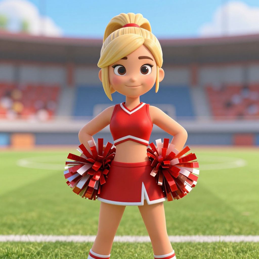 A 3D-rendered animated woman dressed as a cheerleader stands confidently on a sports field during daylight. She wears a red cheerleading outfit with matching pom-poms, her blonde hair tied in a high ponytail, and a playful expression accentuated by a slight blush on her cheek.
