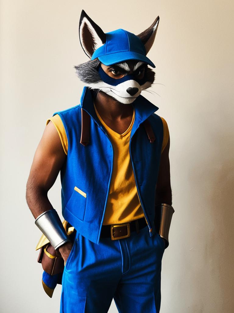 Man cosplay. Wearing Sly Cooper (character) costume. Realistic photo. Dressed as Sly Cooper (character) --sref 1400