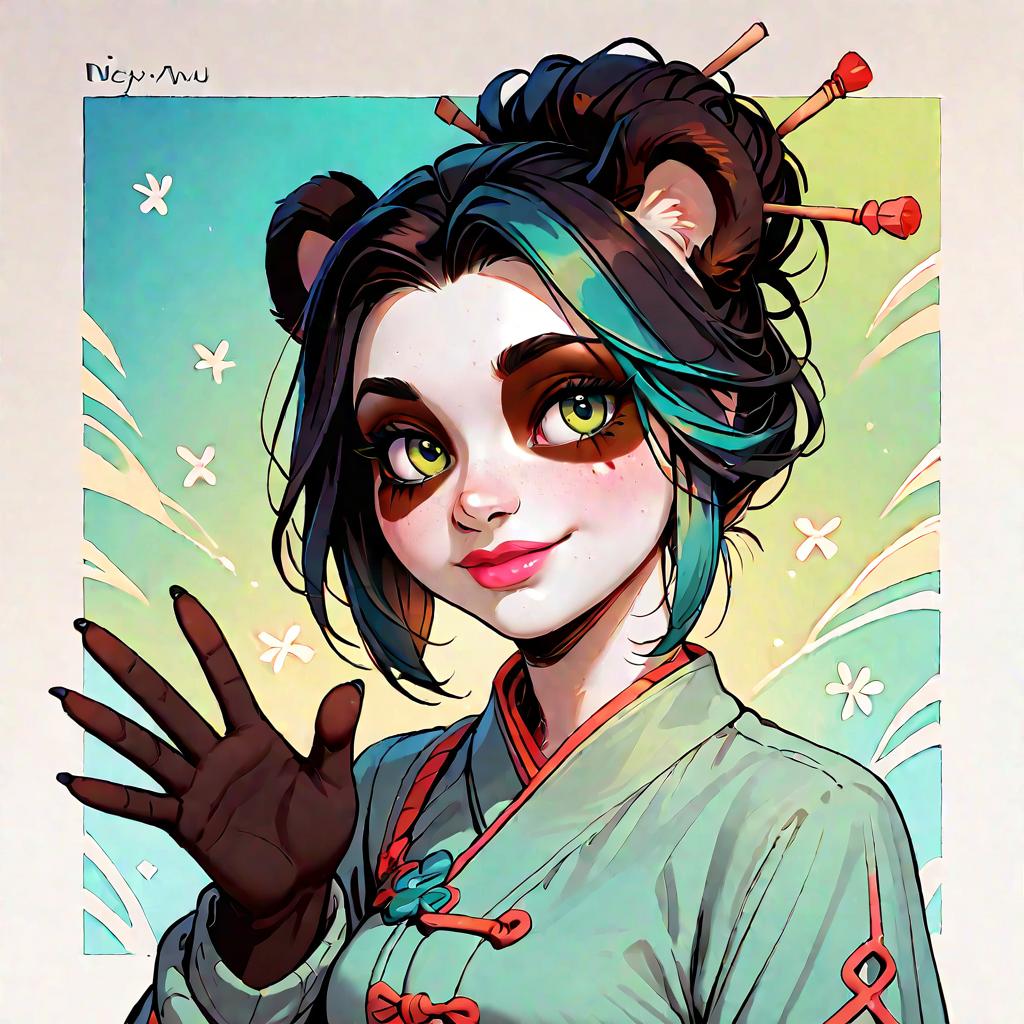 Score_7, score_7_up, score_9, score_ 9_up, , solo, panda girl, pandaren, green eyes, portrait, smile, frontal view, waving hand
