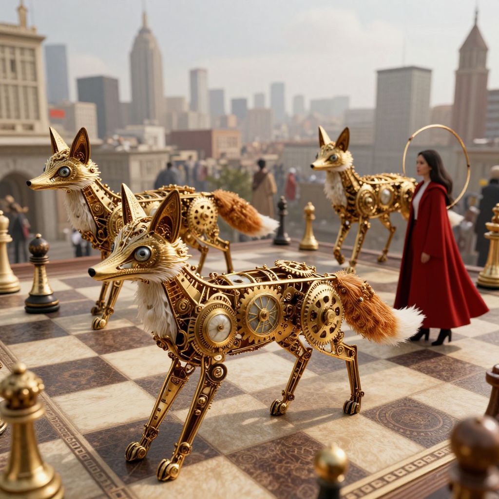 Enormous clockwork foxes, adorned with intricate golden gears and hourglass eyes, stride gracefully through a bustling cityscape atop a vast, checkered chessboard, as a woman in a flowing red cloak follows behind, her own tail extending like a telescopic appendage.