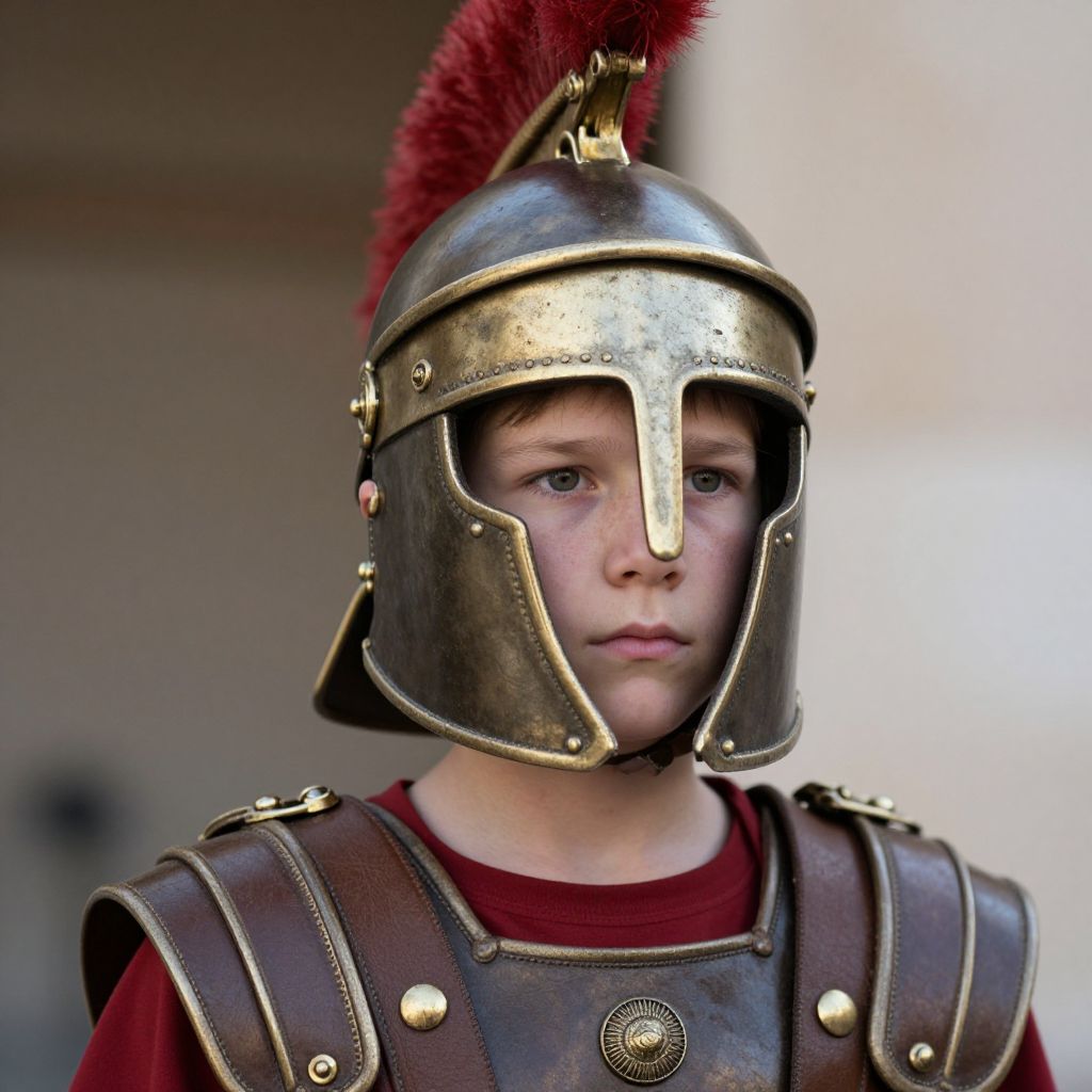 Roman Soldier Costume Boy, a close up of a young boy wearing a roman helmet