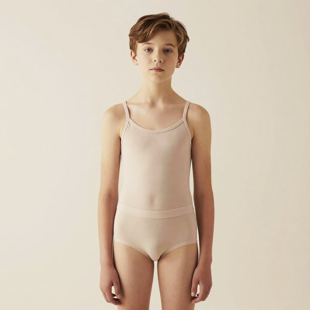 Photograph of a young boy with short brown hair, wearing a light beige, form-fitting leotard, standing against a plain white background.