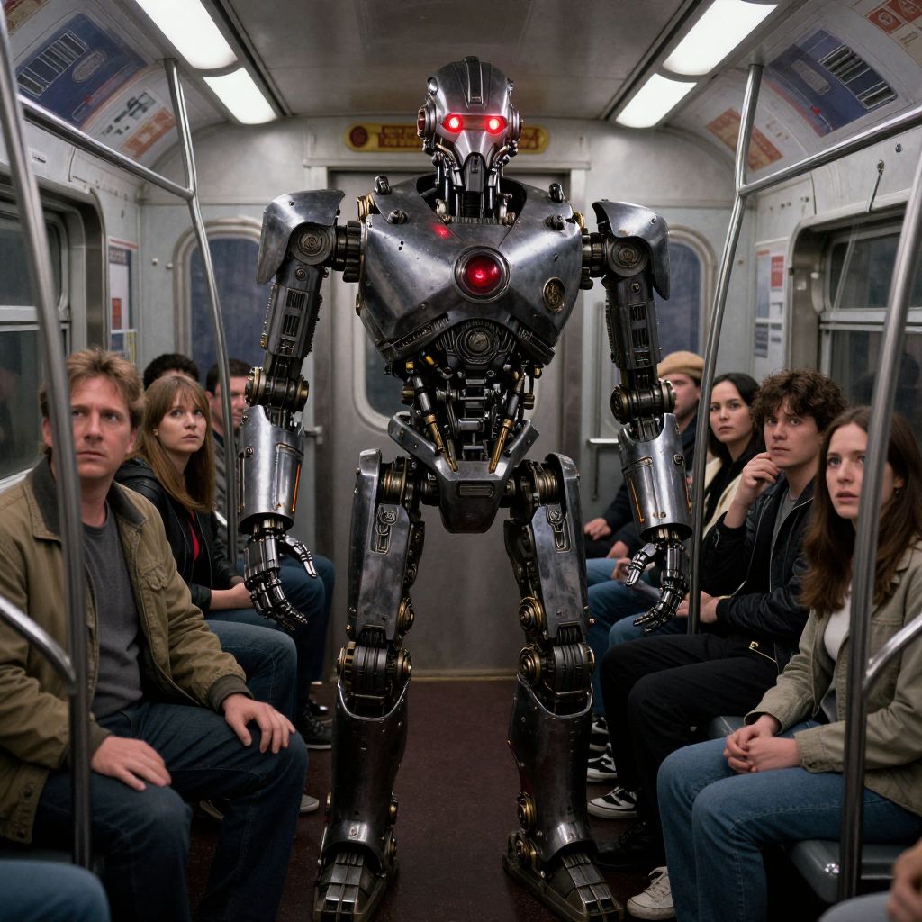 Photograph of a shiny, red-eyed metallic robot standing in a subway car, surrounded by six diverse, casually dressed passengers.