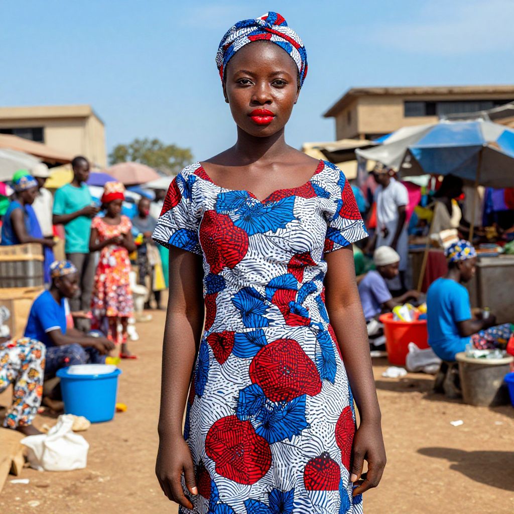 Photograph of a dark-skinned African woman standing in a bustling market. She's wearing a vibrant, patterned dress with red, white, and blue motifs, and a matching headscarf. Her lips are painted bright red. The background shows market stalls, people sitting and working, and a bright blue sky. The scene is colorful and lively, with a mix of textures from the market environment.