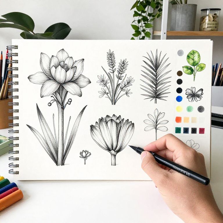 Photograph of a hand sketching black ink botanical illustrations on white paper. The hand, with light skin, holds a black ink pen, adding detail to a large flower with multiple petals and a smaller bud. Surrounding the main drawing are various botanical sketches, including a grass-like plant and fern. To the right, a color palette with green, blue, yellow, red, and black swatches. The background includes a white wall, a green plant, and a shelf with a glass jar and a wooden box. A spiral notebook with colorful pens is partially visible on the left.