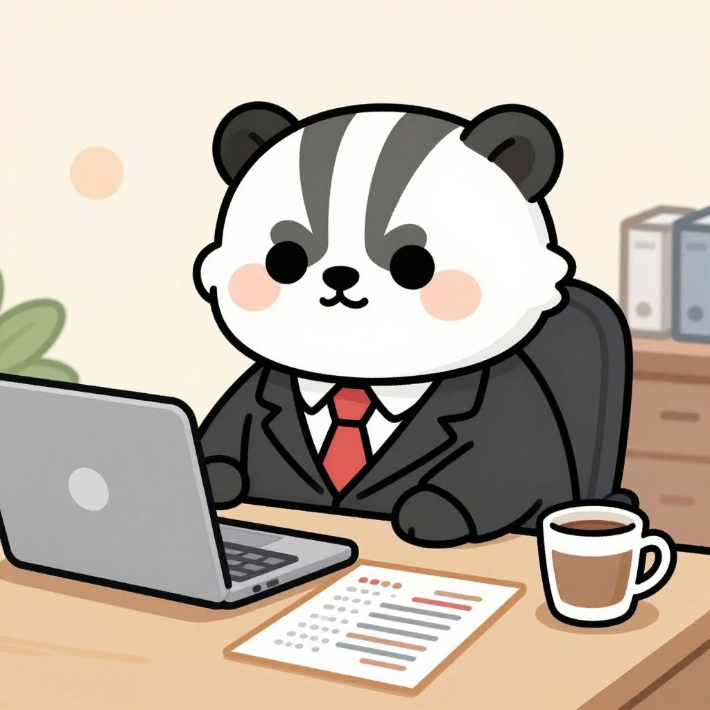 Illustration of a cute and clever cartoon badger dressed in a suit and tie, sitting confidently at a desk with a laptop, a resume, and a cup of coffee in a lighthearted office setting.