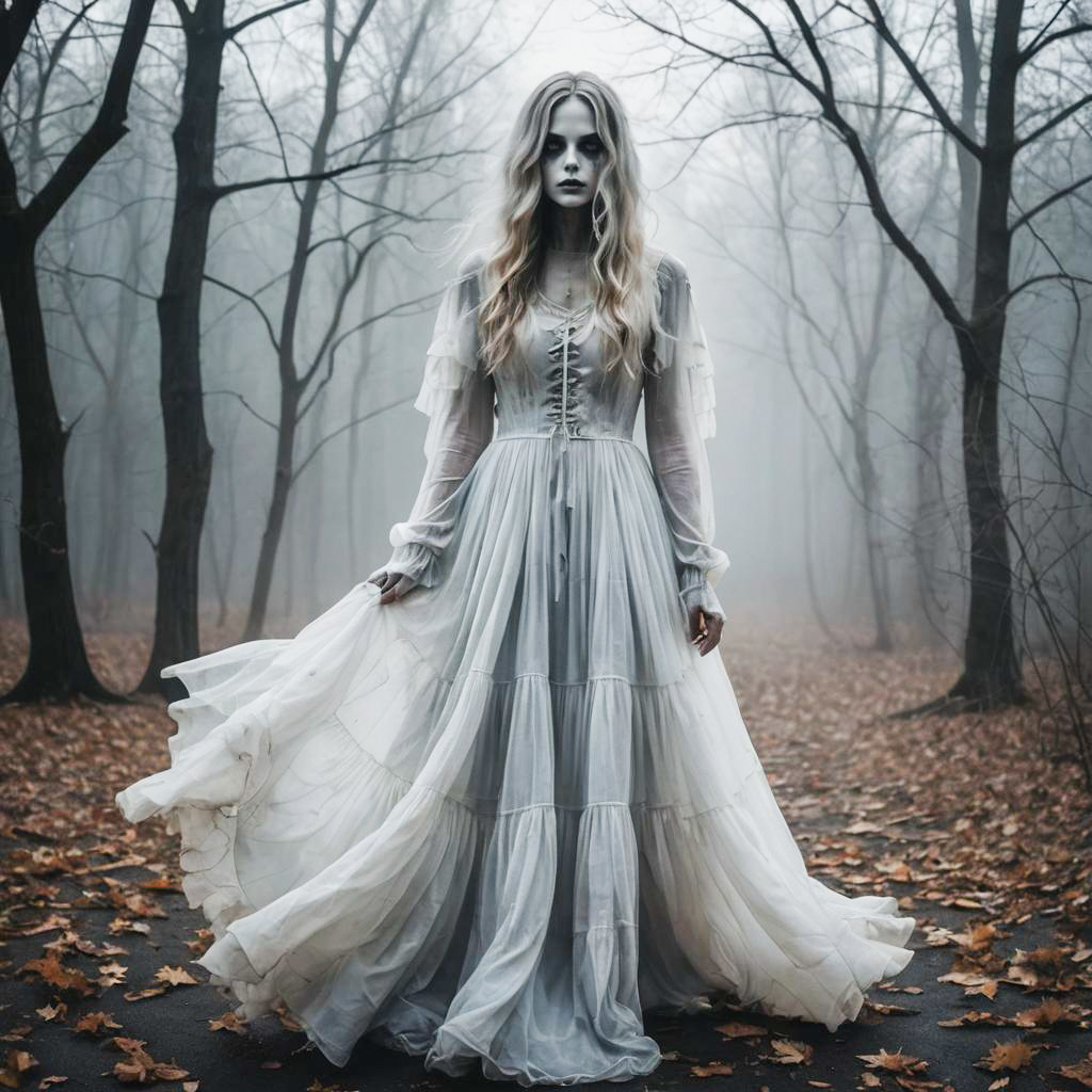 A haunting figure of a creepy ghost stands in a foggy forest, wearing a flowing white gown with a tattered hem and long sleeves. The ghost's pale complexion and dark eye makeup enhance the eerie atmosphere, while the barren trees and fallen leaves add to the spooky setting. The soft pastel tones and foggy overlays create a chilling yet ethereal mood, perfect for Halloween.