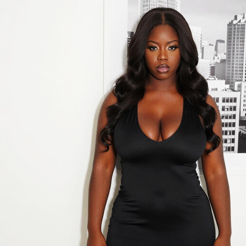 Portrait of a confident curvy Black woman with long wavy black hair and dark brown skin, wearing a form-fitting, low-cut black dress. She stands against a bright white wall with a black-and-white cityscape poster in the background. Her expression is serious and direct, emphasizing her hourglass figure and smooth skin under even lighting.