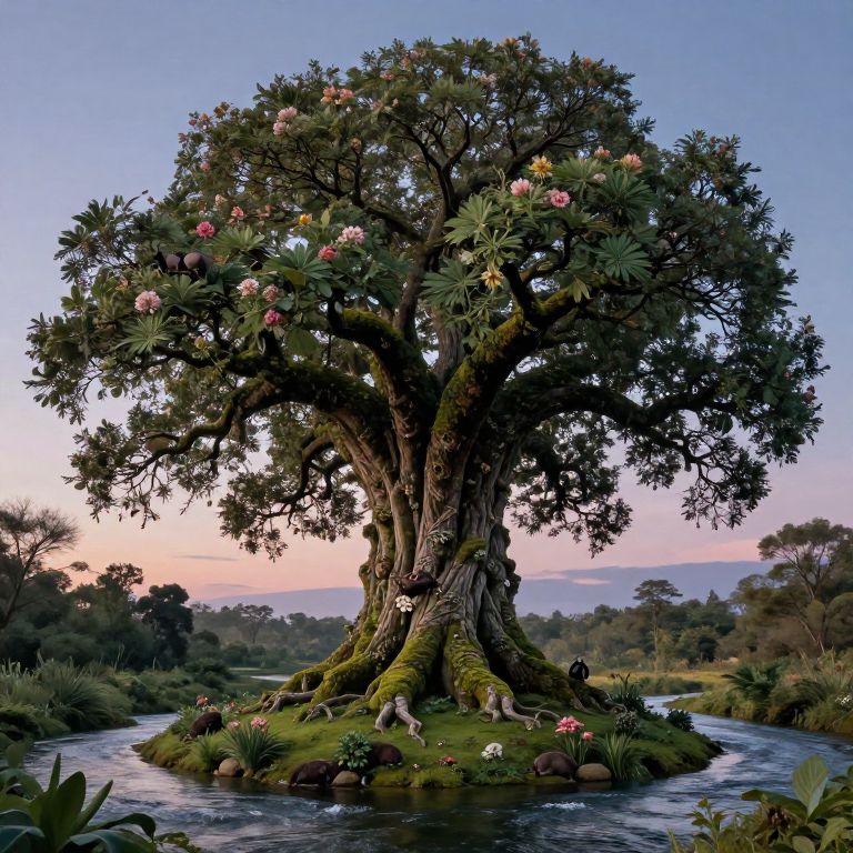 Mother nature tree of life depicted as a giant ancient tree with a wide trunk covered in moss and flowers, animals nesting in its branches, rivers flowing around its base, a serene twilight background emphasizing the balance between earth and sky, richly detailed and atmospheric.