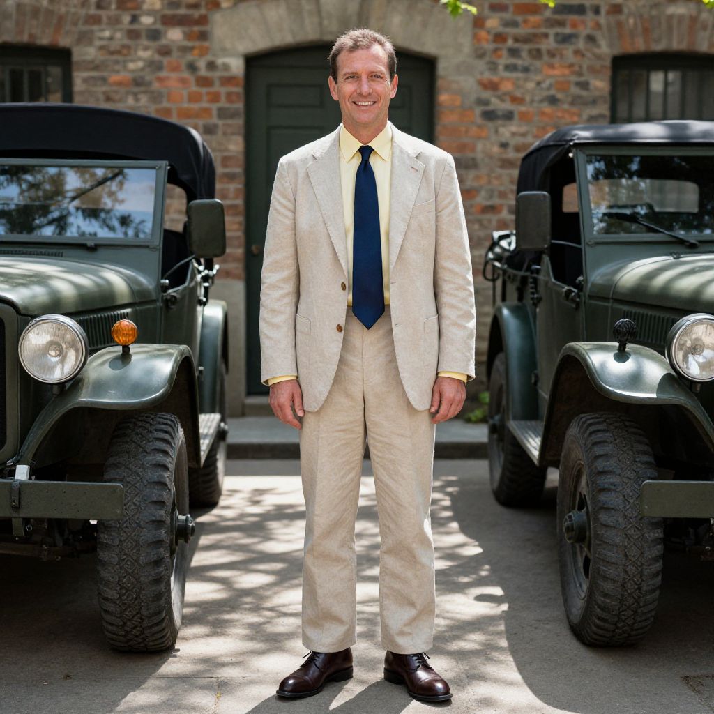 Photograph of a middle-aged Caucasian man with short brown hair, standing in front of two black vintage military-style jeeps. He wears a cream-colored suit with a yellow shirt and dark blue tie. He has a fair complexion and a slight smile. The background features a brick wall with a black door and window. The sunlight casts shadows on the pavement, highlighting the man's formal attire and the jeeps' rugged textures. The man's polished black shoes contrast with the rugged appearance of the jeeps.