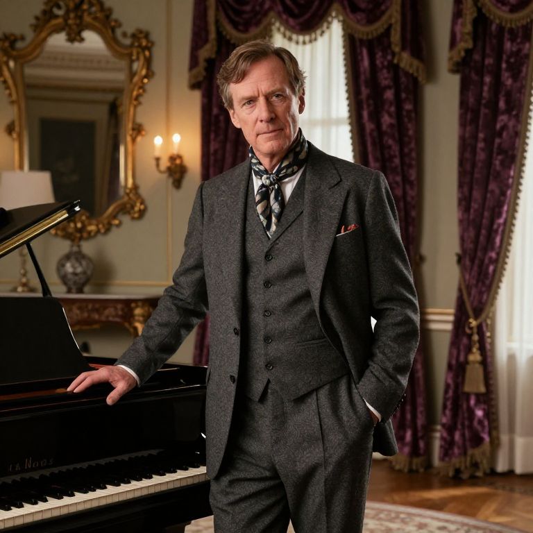 A man, beige cotton suit, pale yellow dress shirt, solid navy silk tie, dark brown leather monk strap shoes, rustic brick facade, vintage military vehicles, sun-dappled courtyard, medium format film, confident smile Man has masculine face and piercing eyes