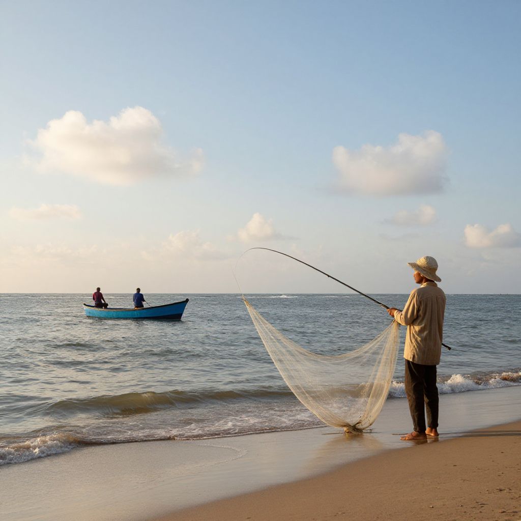 Fisherman stands on the sandy shore, casting a net into the gentle waves as two men row a small blue boat in the distance under a serene sky dotted with fluffy clouds.