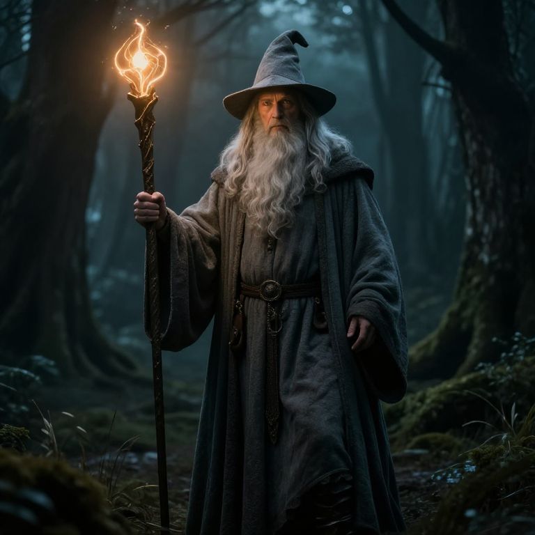 Photograph of a wise, bearded wizard with a glowing torch, wearing a grey robe and pointed hat, standing in a dark, misty forest
