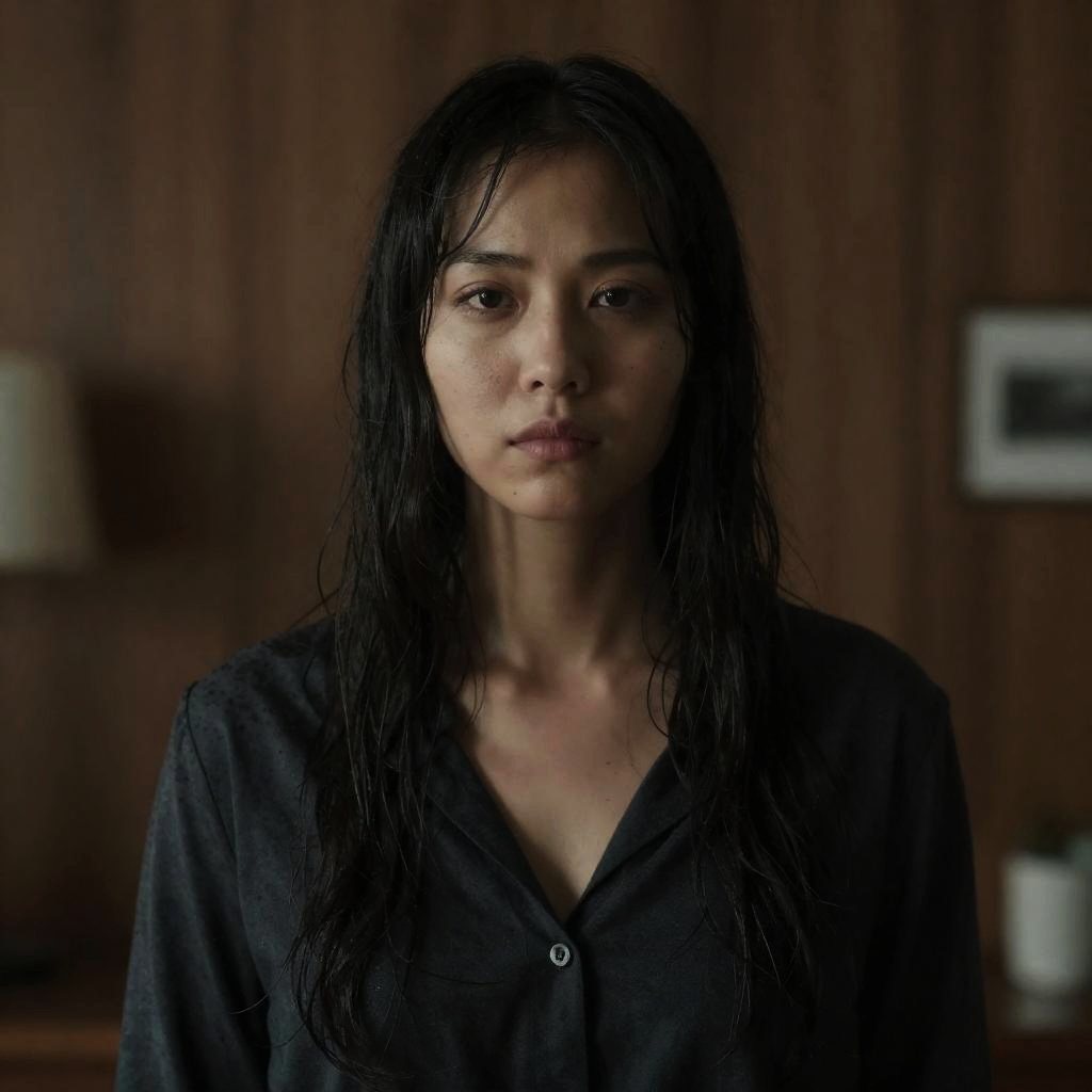 Photograph of a terrified woman with long, wet, dark brown hair, covered in blood and sweat. She is crouched forward, eyes wide open in fear, with intense expression. Background has bright, blurred flames and smoke. Her skin is glistening and she is wearing a dark, tattered top. Warm, orange lighting. Blurry, fiery background.