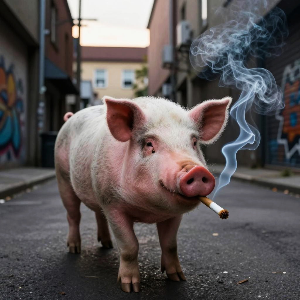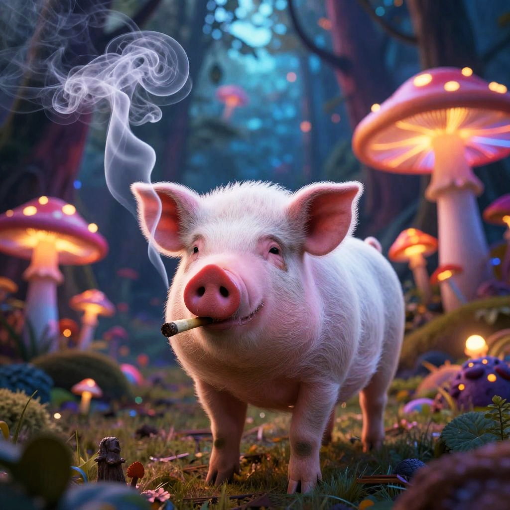 Pig smoking a joint in a colorful psychedelic forest, glowing neon mushrooms, trippy smoke swirls, detailed fur texture, vibrant surreal background