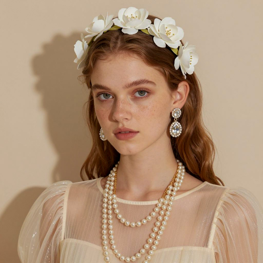 Photograph of a young woman with light skin and blue eyes, wearing a large, ruffled, multi-colored hat and collar made of pink, orange, and blue tulle. Her lips are slightly parted. Background includes blurred rocks. Her face is centered, and she gazes directly at the camera. The hat and collar have intricate, layered ruffles with translucent ures.
