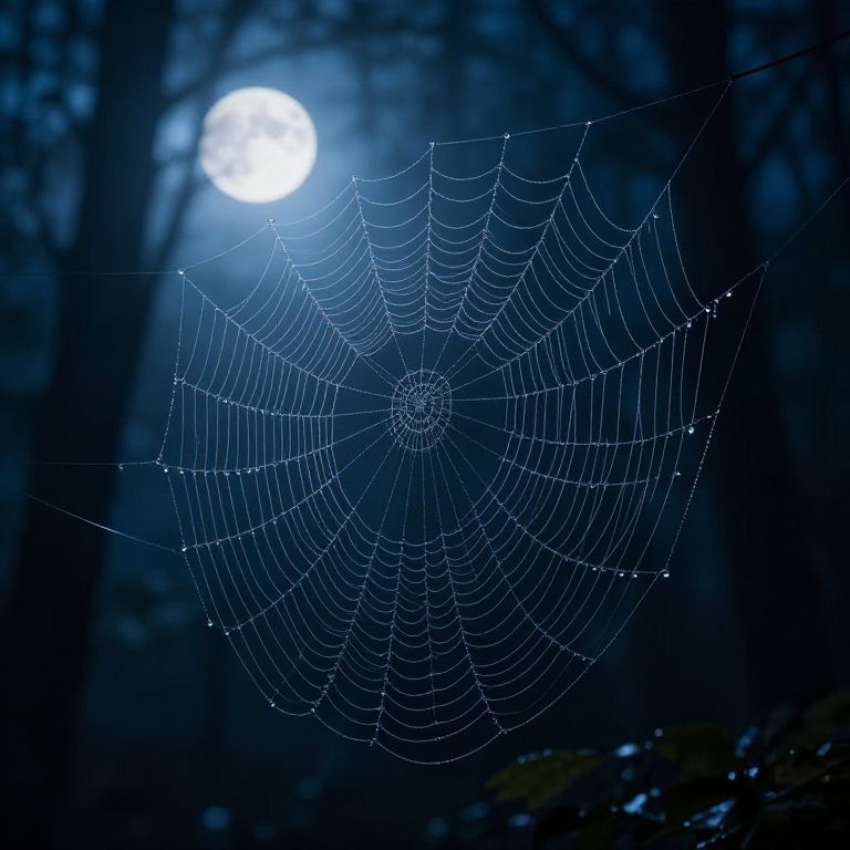 Spun threads forming an intricate web in a mystical forest, glowing softly under the moonlight, with delicate dewdrops hanging from the silk strands, creating a surreal and ethereal atmosphere.
