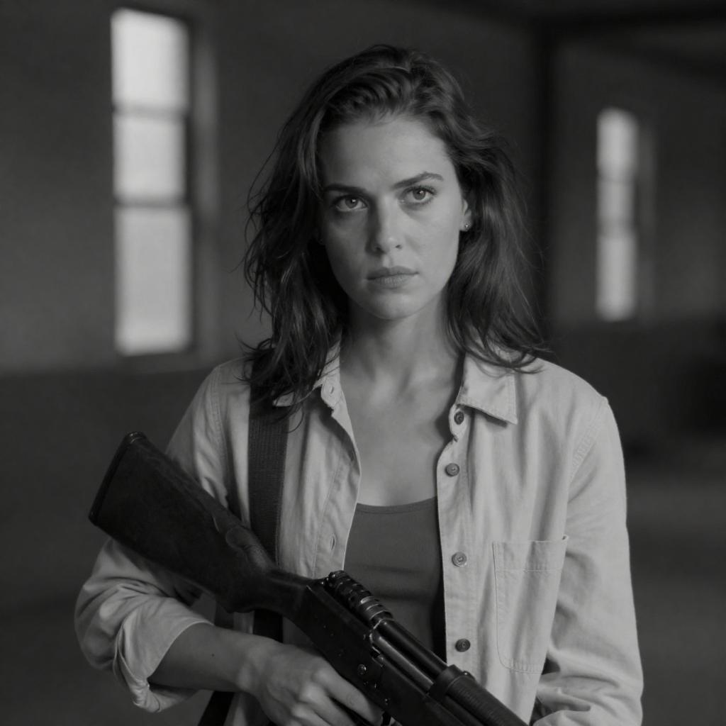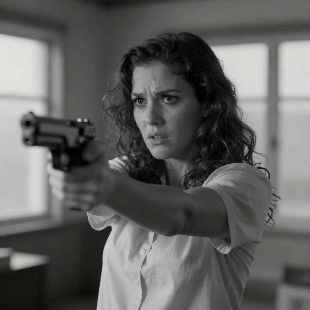 Black-and-white photograph of a frightened woman with wavy hair, pointing a gun forward. She wears a light-colored shirt, and the background shows a blurred interior with windows. The image has a high-contrast, grainy ure, emphasizing her tense expression and the gun's barrel.