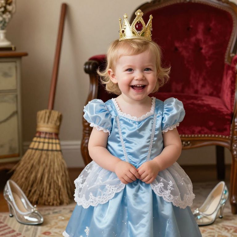 A playful toddler with a bright smile and soft blonde hair, wearing a classic Cinderella outfit with a lace-trimmed dress and a golden crown, laughing in a living room decorated with vintage fairy-tale props like a broom, a glass slipper, and a red velvet chair, warm and cozy lighting, realistic portrait photography