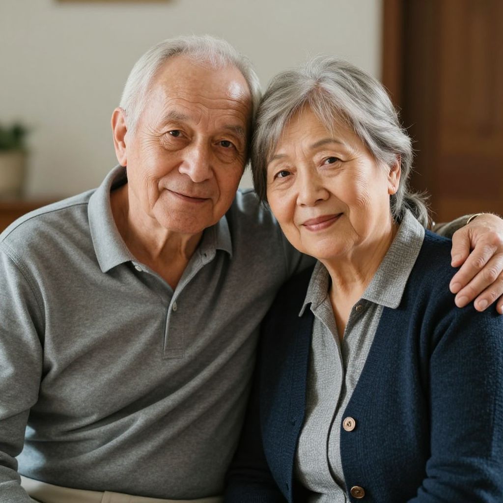 Photograph of four older adults, two men and two women, sitting outdoors, smiling, wearing casual sweaters, blue jeans, with a blurred green