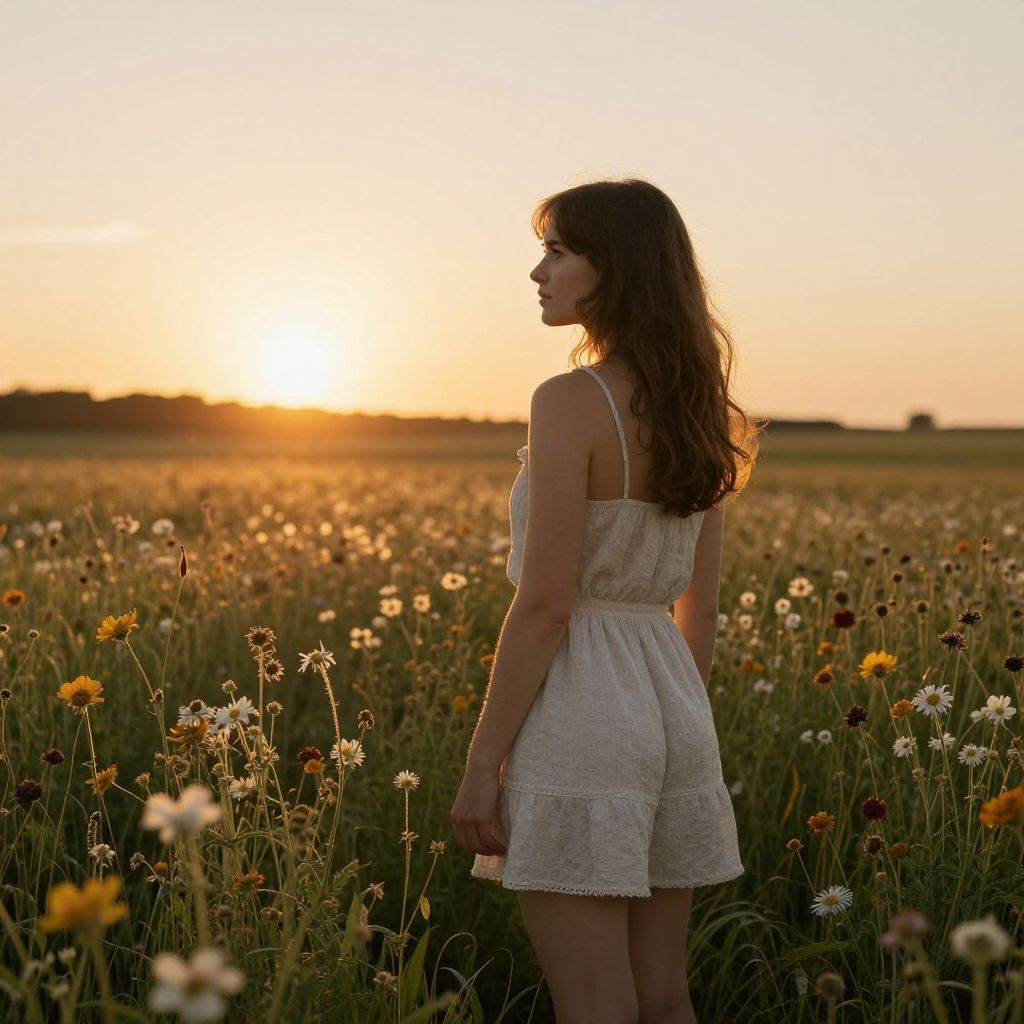 Woman standing in a sunlit meadow, her back turned to the camera as she gazes toward the setting sun, surrounded by wildflowers and bathed in golden light.