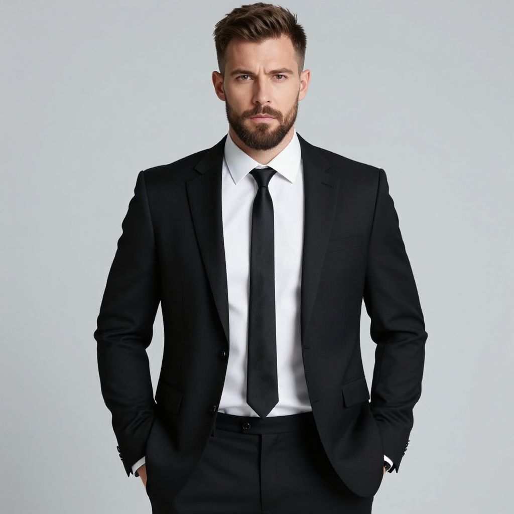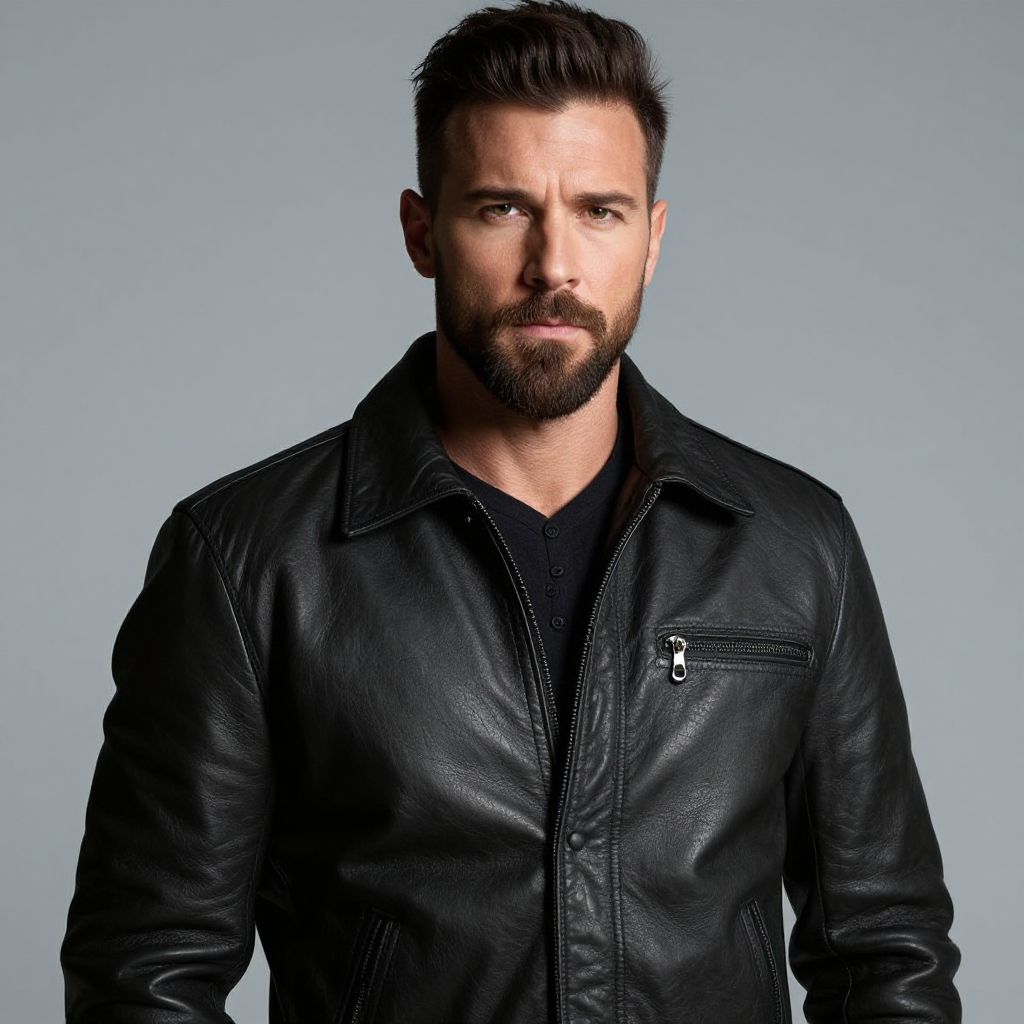 A portrait of a confident man with a closely trimmed beard, dressed in a stylish leather jacket, exuding a sense of strength and sophistication.