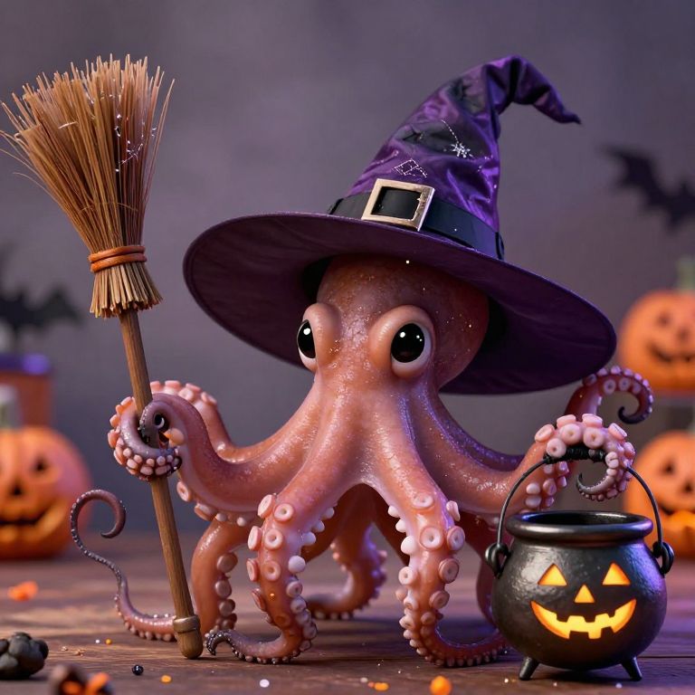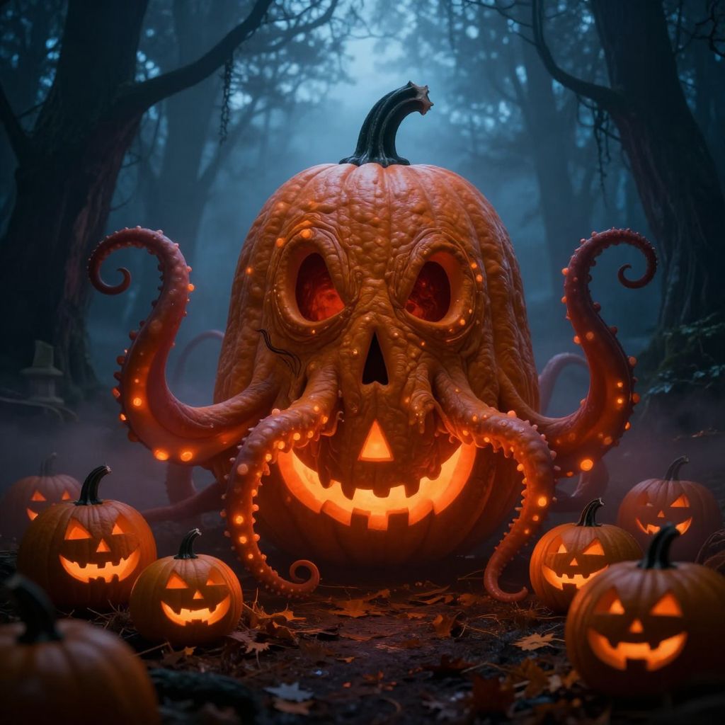 A giant kraken pumpkin with twisting glowing tentacles surrounded by carved pumpkins in a foggy haunted forest, mysterious shadows and flickering lanterns, intricate pumpkin skin details, eerie twilight setting, surreal Halloween theme