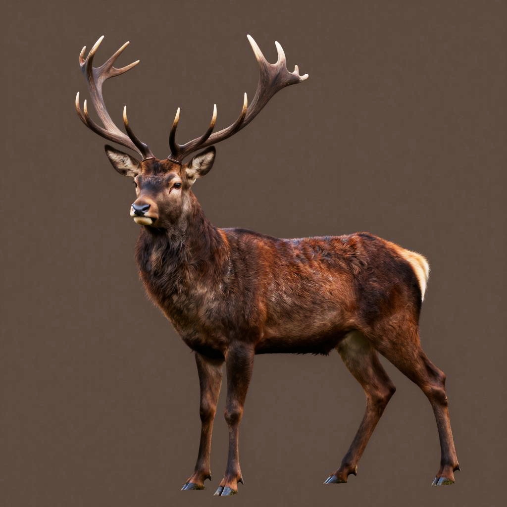 Majestic mountain stag in a deep mahogany with soft textures and subtle hues. Rendered with warm lighting, the form incorporates organic shapes in a dynamic pose.