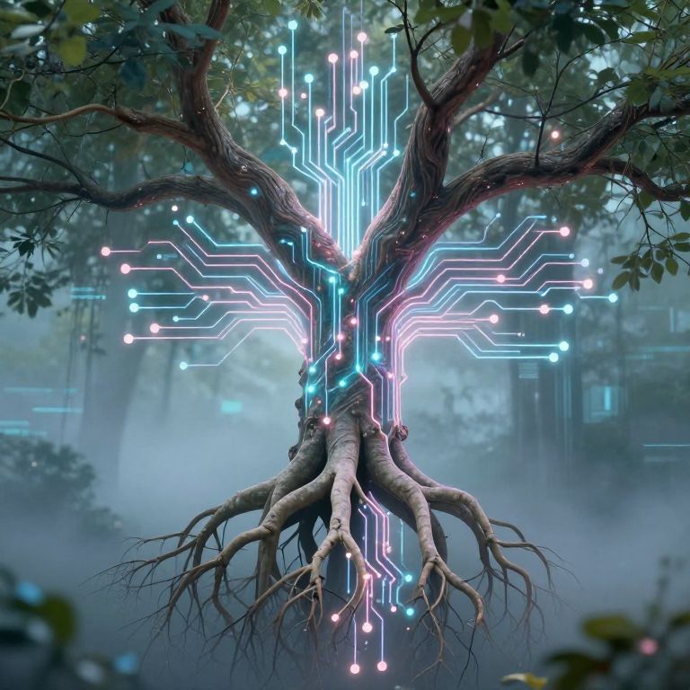 Photorealistic digital artwork of a tree with thick, twisting roots and a large, branching trunk. Neon blue and pink circuit-like patterns illuminate the tree, resembling a glowing cross. Small, bright dots of light are scattered along the branches. The background is a misty forest with blurred, dark green foliage. The tree's bark is textured and rough, contrasting with the smooth, futuristic light patterns. The image combines natural and digital elements, blending organic and technological aesthetics.