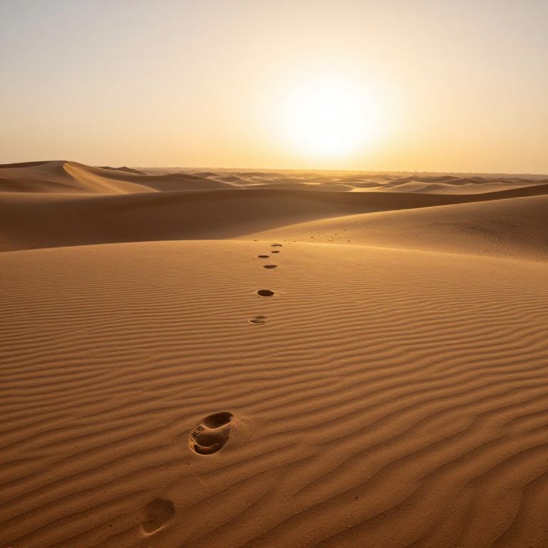 Footprints trail across rippling golden sands as the sun ascends, casting a warm glow over endless dunes under a hazy horizon.