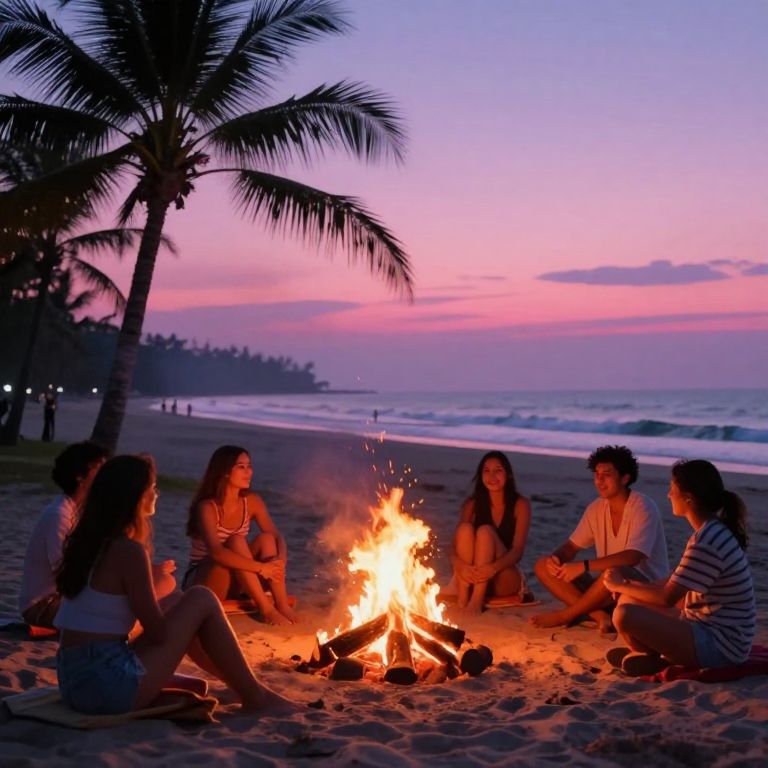 Group of six young adults sitting around a glowing bonfire on a sandy beach at dusk, with palm trees silhouetted against a pink and purple sky. Gentle ocean waves are visible in the background, creating a relaxed and dreamy atmosphere. The friends are casually dressed, enjoying the warm fire and beach setting.
