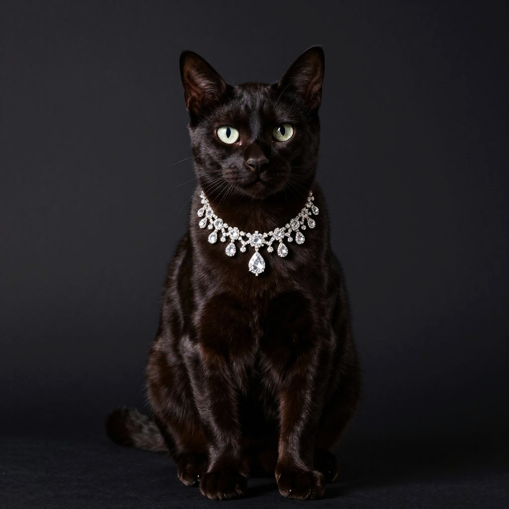 Luxurious studio portrait of a Ocicat cat sitting upright, glossy dark fur, wearing an ornate sparkling diamond necklace, clean dark background with spotlight, high-end fashion pet photography, high resolution, ultra-detailed