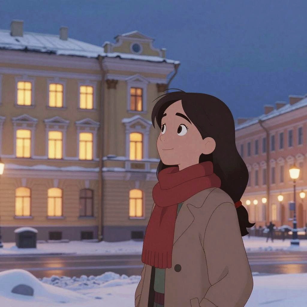 Anastasia animation style scene featuring a snowy Saint Petersburg cityscape with intricate architectural details, warm glowing windows, and a hopeful young girl looking out thoughtfully.