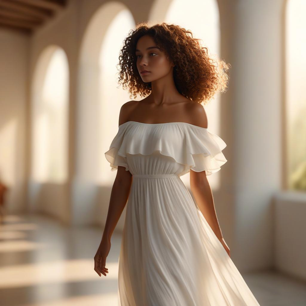 Photorealistic, cinematic lighting, 8K, perfect shading, 50mm lens f/2.8, full-body shot of a woman with shoulder-length curly hair and warm brown skin, wearing a long, flowing white dress. She stands barefoot with a relaxed stance, against a softly blurred background.