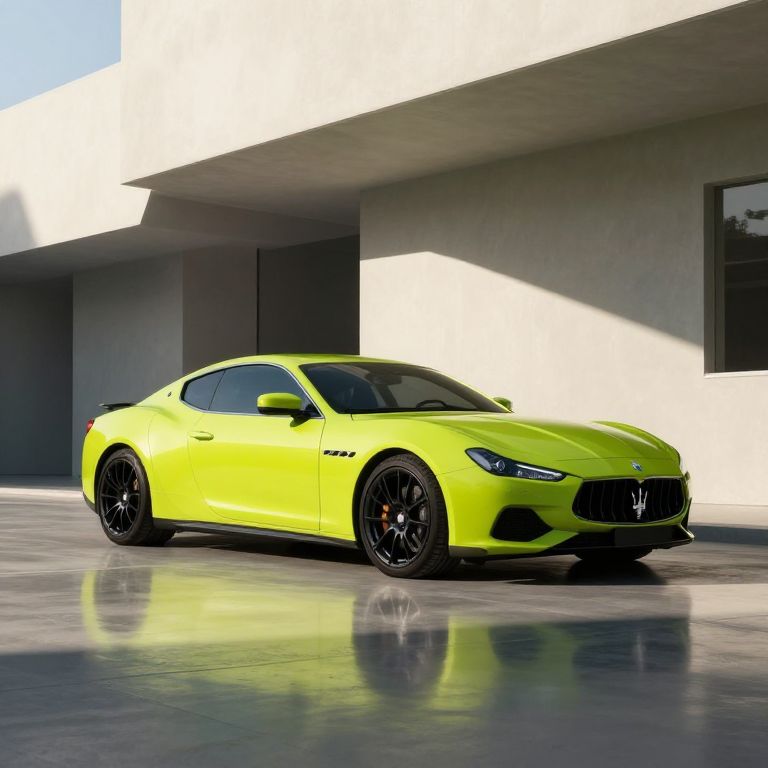 Lime green Maserati parked in front of modern minimalist architecture, sharp shadows from late afternoon sun, reflection on polished concrete floor, luxurious and stylish vibe, crisp and clean composition, rich lime green tone highlighting the car's curves